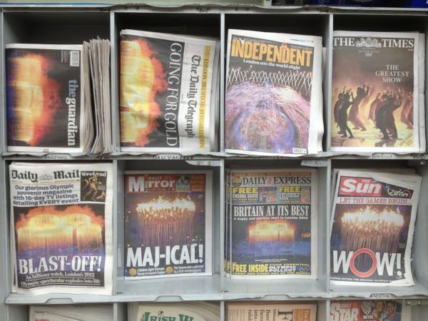 Loyal readers know how I'm a newspaper junkie. So, when I saw this picture of the Saturday newspaper coverage in London of Friday's opening ceremony, I had to post it.